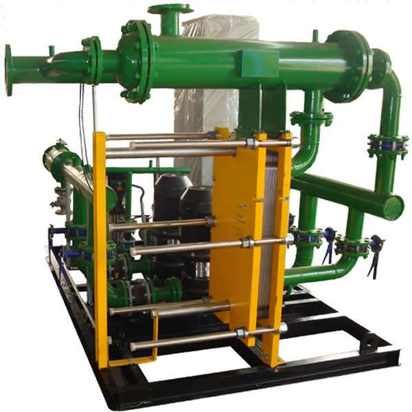 換熱機(jī)組是把一次熱網(wǎng)提供的熱量,自動(dòng)連續(xù)的轉(zhuǎn)換為用戶需要的生活用水及采暖用水的熱量。機(jī)組中集成了板式換熱器、循環(huán)泵、補(bǔ)水泵、溫度計(jì)、壓力表、各種傳感器、管路和閥門,并可根據(jù)客戶的要求加裝補(bǔ)水系統(tǒng)、穩(wěn)壓系統(tǒng)、變頻流量控制系統(tǒng)、熱量計(jì)量及網(wǎng)絡(luò)通訊控制系統(tǒng)。