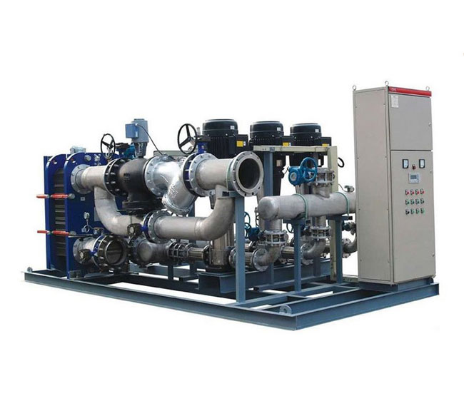 二次水經(jīng)過過濾除污,經(jīng)由循環(huán)進入換熱器,被蒸汽或高溫水加熱后進行供熱。蒸汽或高溫水進入板式換熱器后,變成凝結水或高溫回水返回熱源,進行一、二次供熱系統(tǒng)的回路循環(huán)。補水泵將軟水打入系統(tǒng)中以保持系統(tǒng)壓力的恒定.